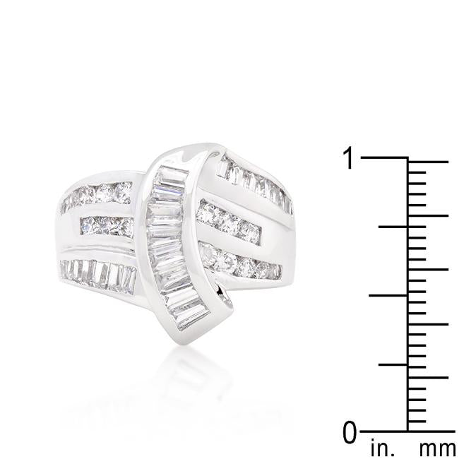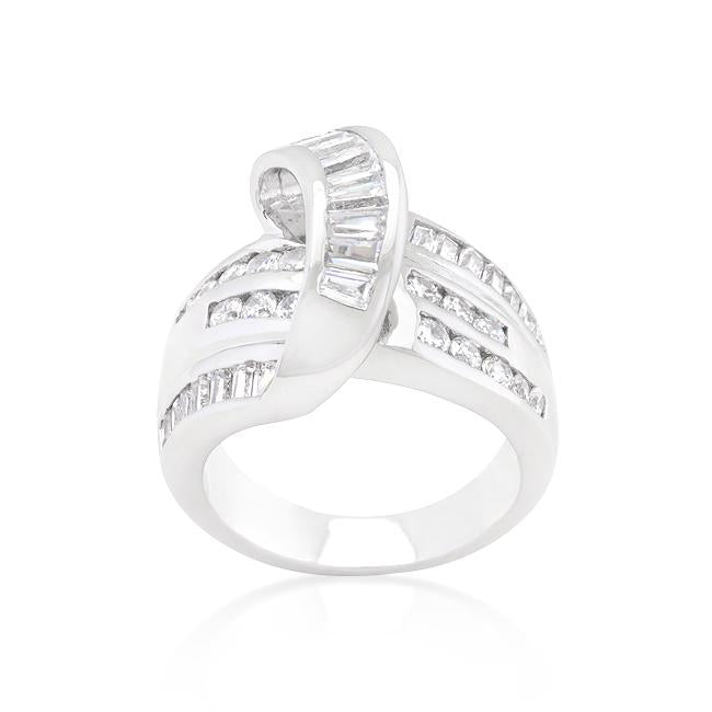 Channel set cubic zirconia stones in a diagonal design mingle together to create this classic overlapping cocktail piece. Our genuine rhodium finish is achieved using an electroplating process that coats the item with heavy layers of rhodium a close cousin to platinum which gives our jewelry a platinum luster.
