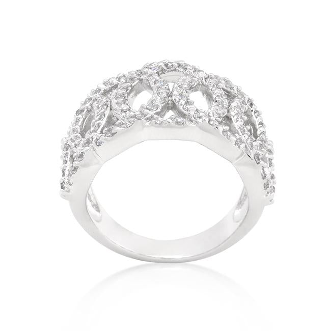 Multiple circles intertwine to create the sparkling illusion of this fashion ring. Our genuine rhodium finish is achieved using an electroplating process that coats the item with heavy layers of rhodium a close cousin to platinum which gives our jewelry a platinum luster.