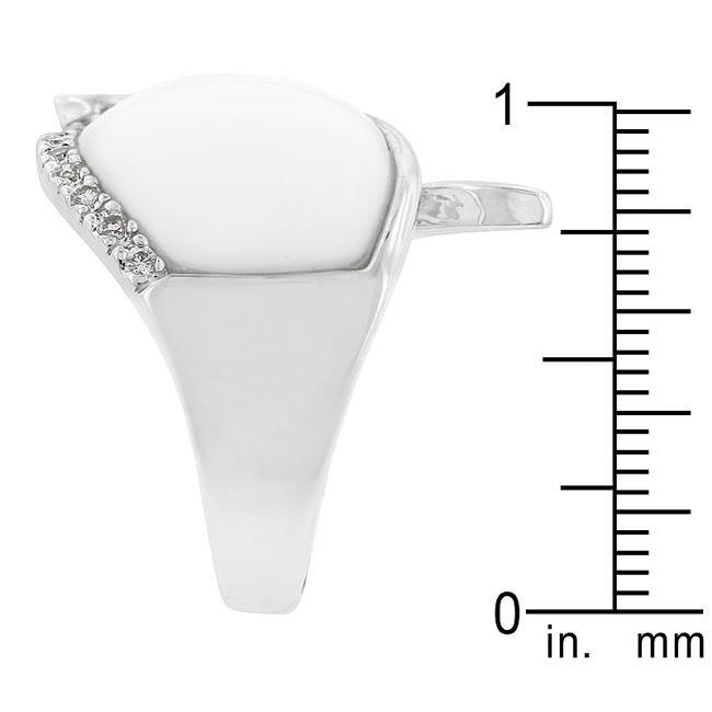 The Snow Cap Cocktail Ring has a uniquely shaped synthetic white onyx center stone with a clear cubic zirconia that is handset in silver tone. Genuine Rhodium Plating is achieved using an electroplating process that coats the item with heavy layers of rhodium a close cousin to platinum which gives our jewelry a platinum luster.