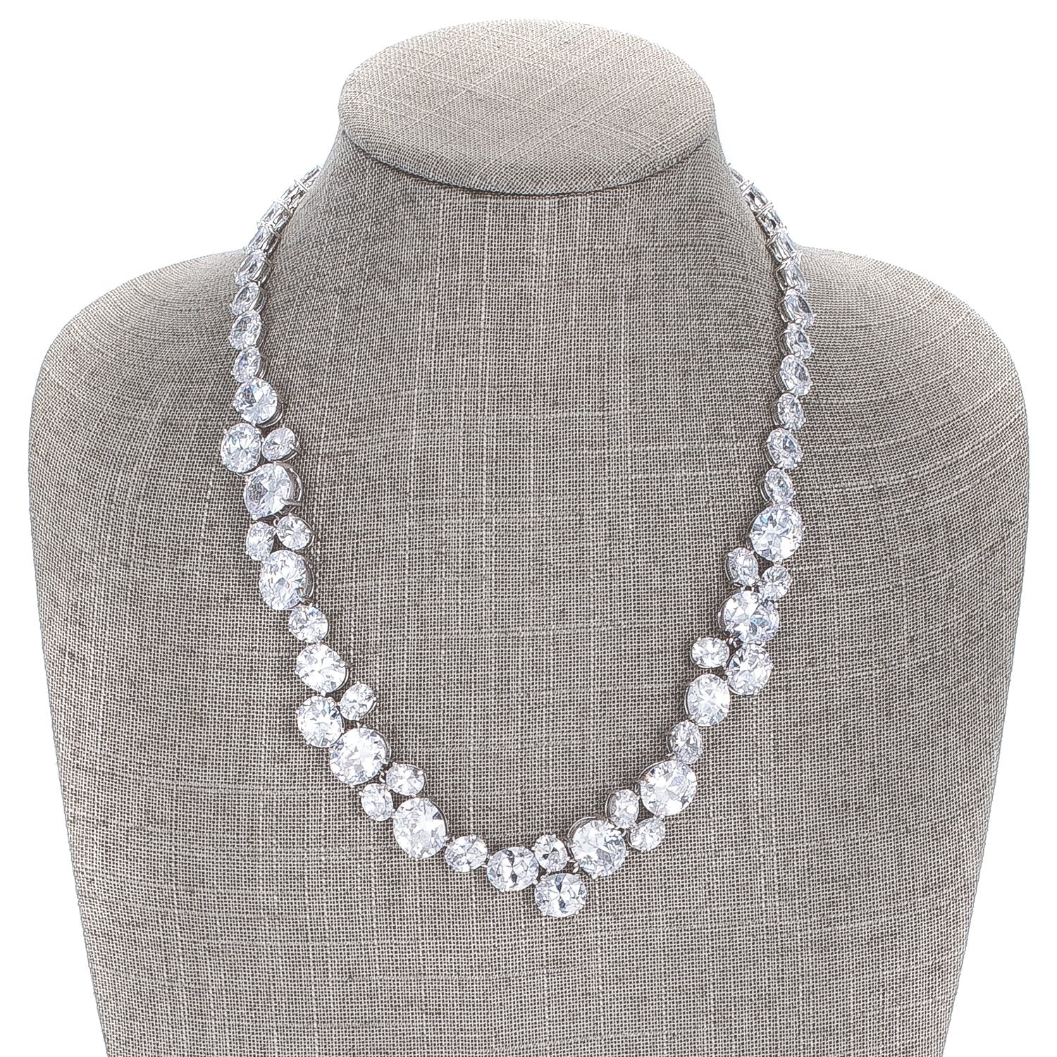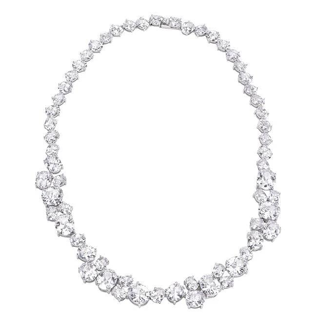 Adopt a piece of glamour with our Bejeweled Collar Necklace. Set with glistening oval cut cubic zirconia this instant classic is a must-have for dressing up the most basic of wardrobes. Our genuine rhodium finish is achieved using an electroplating process that coats the item with heavy layers of rhodium a close cousin to platinum which gives our jewelry a platinum luster.