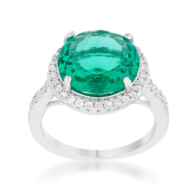 Small pave set stones accent a round solitary emerald green stone in this beautifully classic ring.