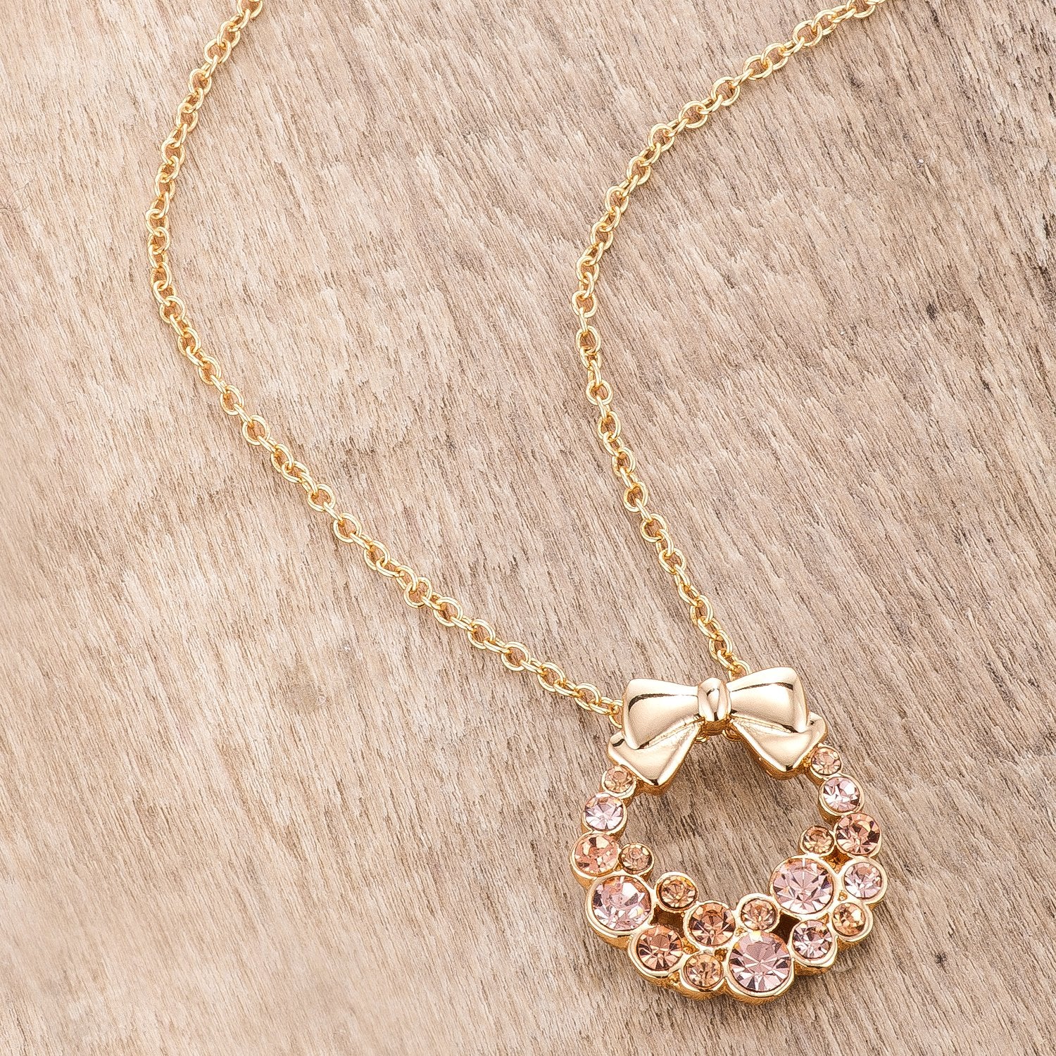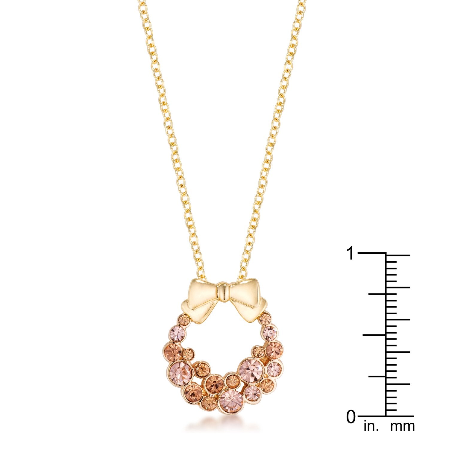 Spread holiday cheer with this holiday wreath pendant. Fashioned with elegant champagne crystals its the classic accompaniment to that holiday ensemble! 18k plated gold is achieved using an electroplating process that coats the item with heavy layers of 18k Yellow Gold and color-treated to display a perfect 14k Hamilton gold color.