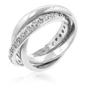 This piece features an eternity band glistening with petite cubic zirconia and is intertwined with two silver-toned bands. Our genuine rhodium finish is achieved using an electroplating process that coats the item with heavy layers of rhodium a close cousin to platinum which gives our jewelry a platinum luster.