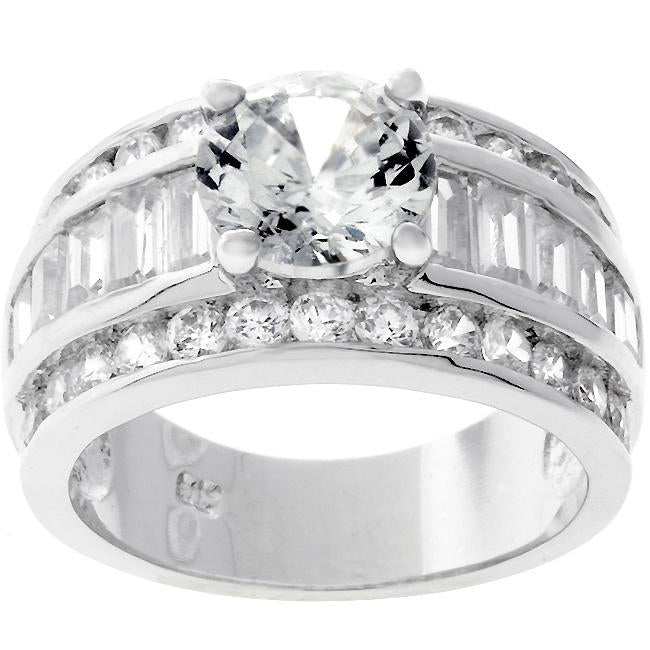 The Luxurious Engagement Ring features a brilliant round cut cubic zirconia in a prong setting displayed on the shouldered assortment of shimmering baguettes and round cut cubic zirconia in a channel setting. Genuine Rhodium Plating is achieved using an electroplating process that coats the item with heavy layers of rhodium a close cousin to platinum which gives our jewelry a platinum luster.