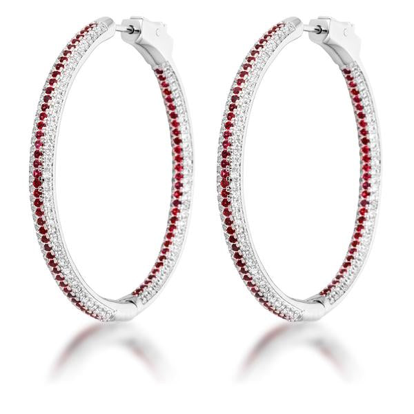 A contemporary classic, these hoops are perfect for a sophisticated sparkle. With their intricate micro pave setting, these hoop earrings add style and glamour to your fashion. These earrings are glittering with white and red cubic zirconia and make a lovely accent to both casual or formal wear.