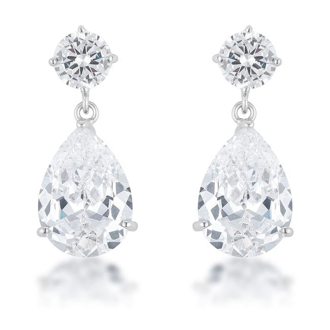 These beauties sparkle from a distance! With a round cubic zirconia at the stud and a dangling pear-shaped cubic zirconia the sparkle is over the top. The metal is rhodium plated the same coating used for white gold. These charming earrings will make any girl shine.