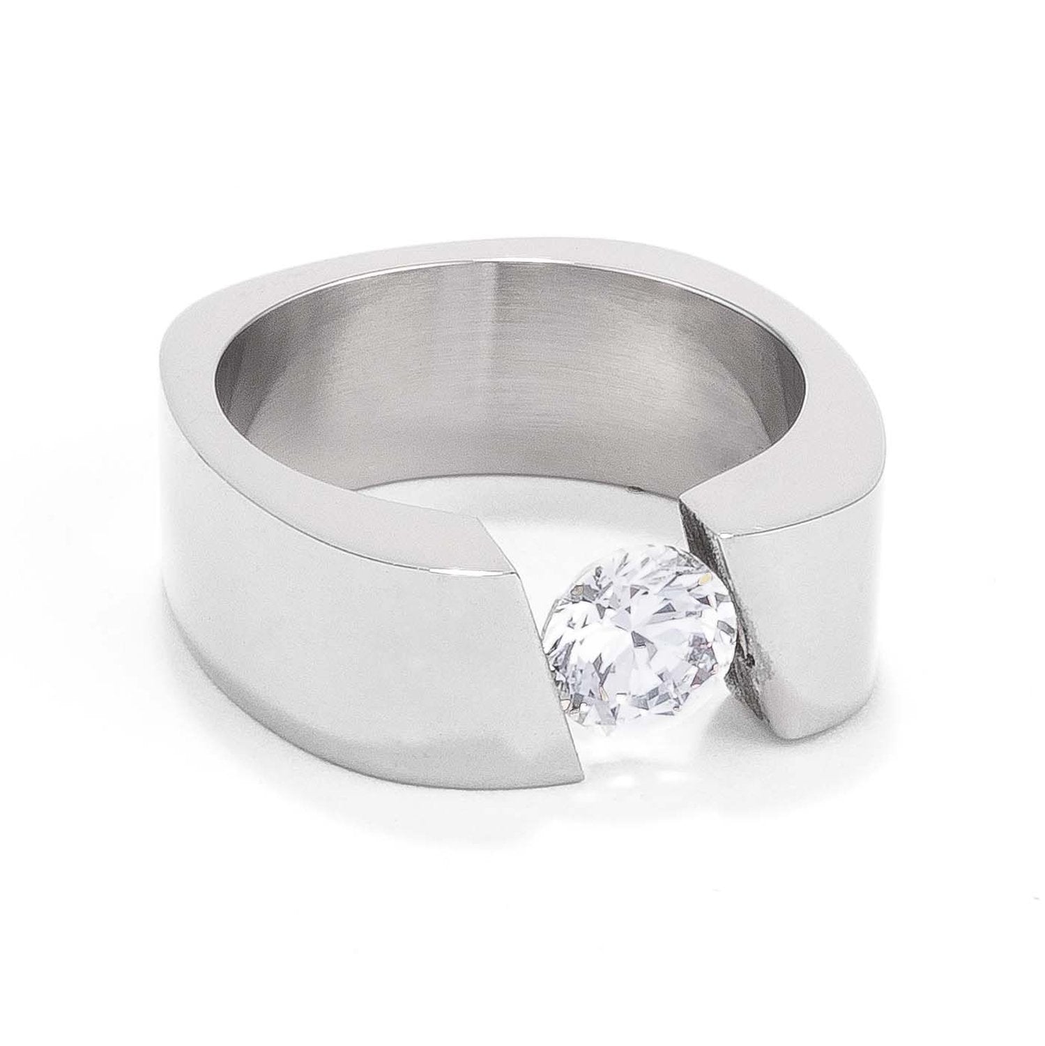 This 7mm stainless steel band features a clear tension set cubic zirconia. Contemporary and simple its the perfect everyday ring with a little bit of sparkle.