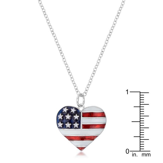 My country tis of thee and with this beautiful necklace you can show the world your heart for the United States. With red white and blue enamel setting the stage and round clear cubic zirconia accenting the stars the flag has never looked so good. The metal is rhodium plated and thats the same thing that gives white gold its shine. Everyone will notice this necklace.
