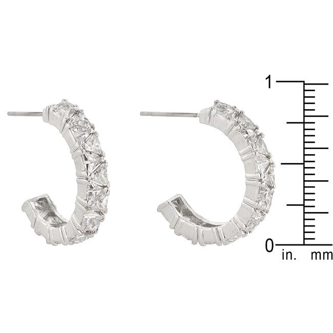 Clear trillion cut stones line the shape of these hoop earrings lending a feel of class and glamour. Our genuine rhodium finish is achieved using an electroplating process that coats the item with heavy layers of rhodium a close cousin to platinum which gives our jewelry a platinum luster.